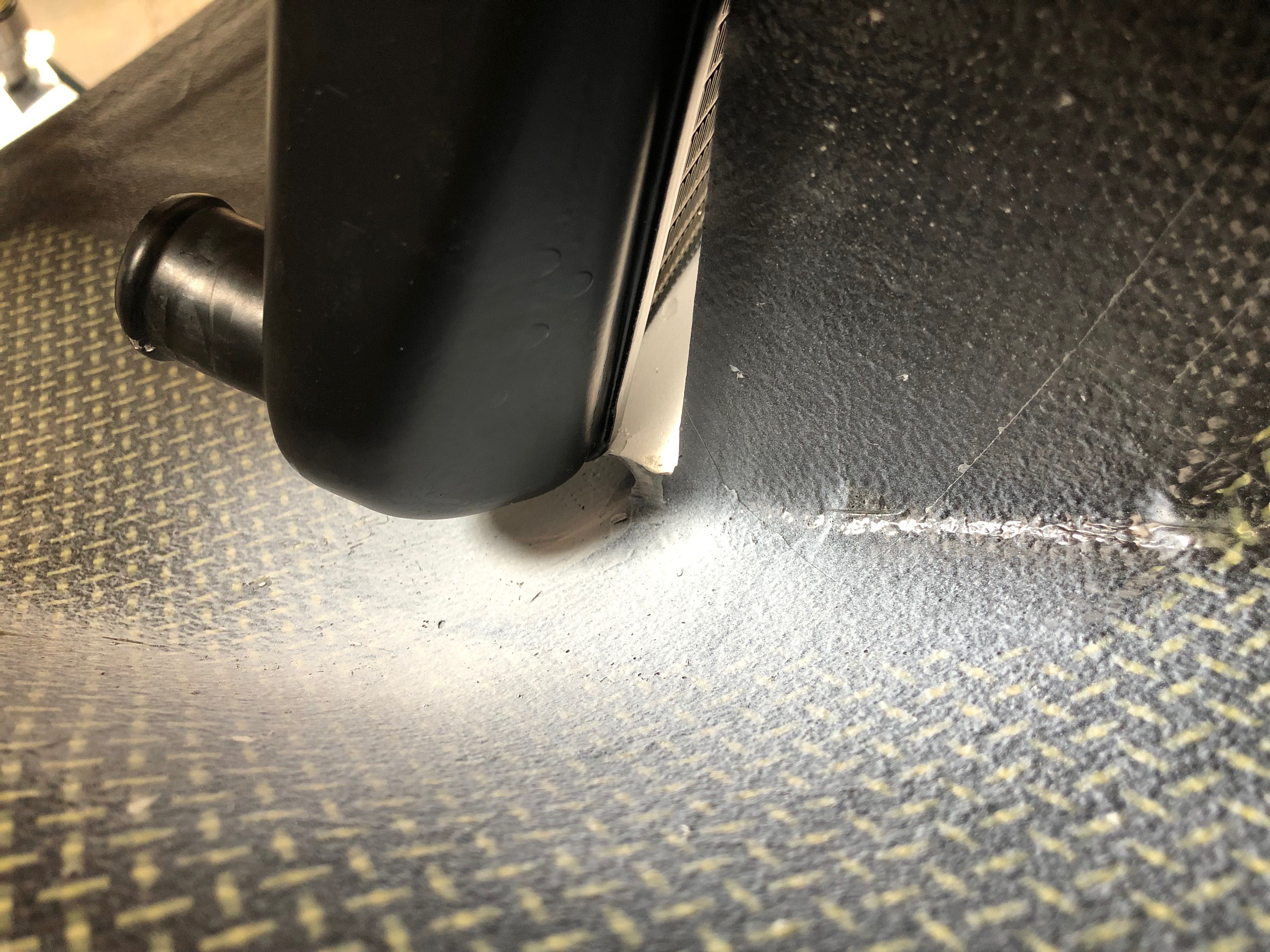 The aluminium water radiator brackets were moved to underneath the black bracket which seems to work much better than the original fit.
