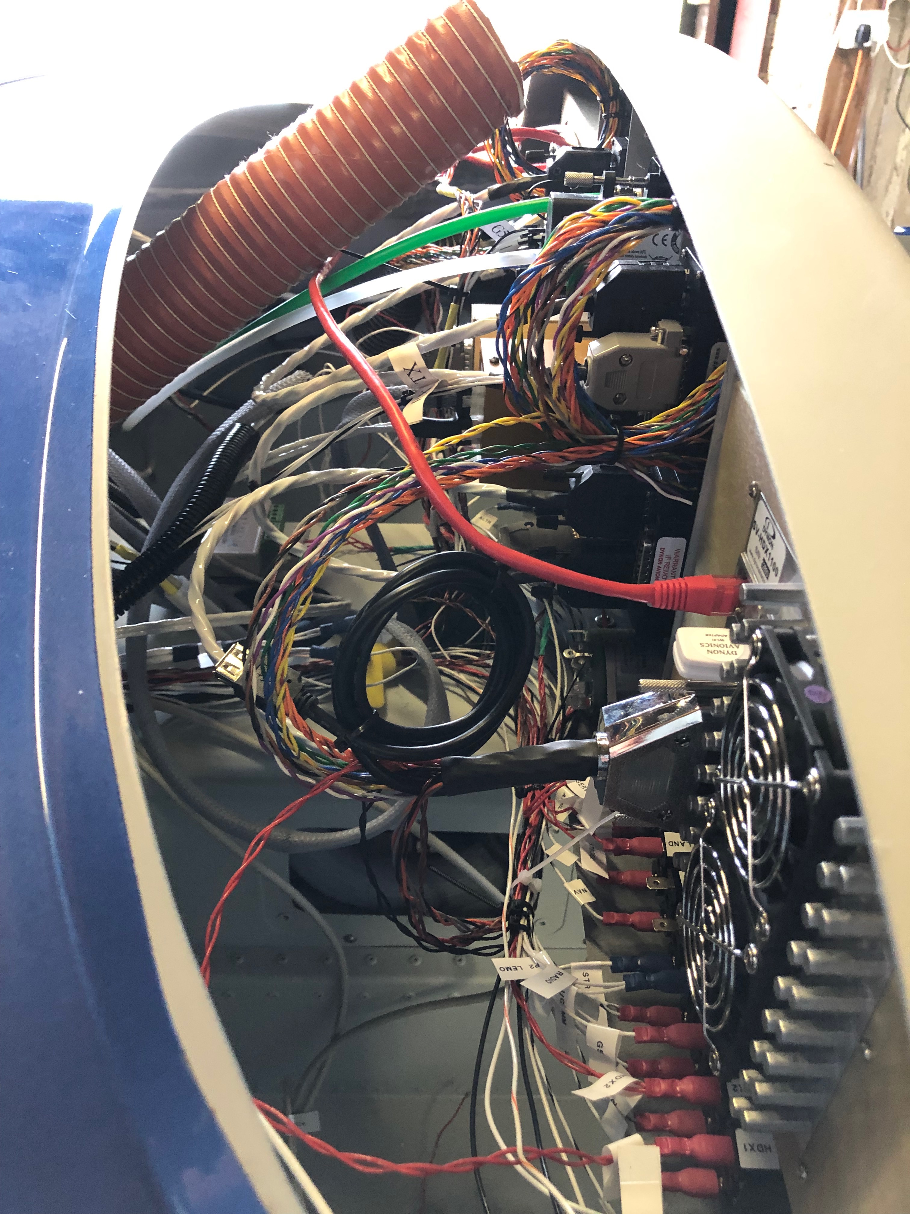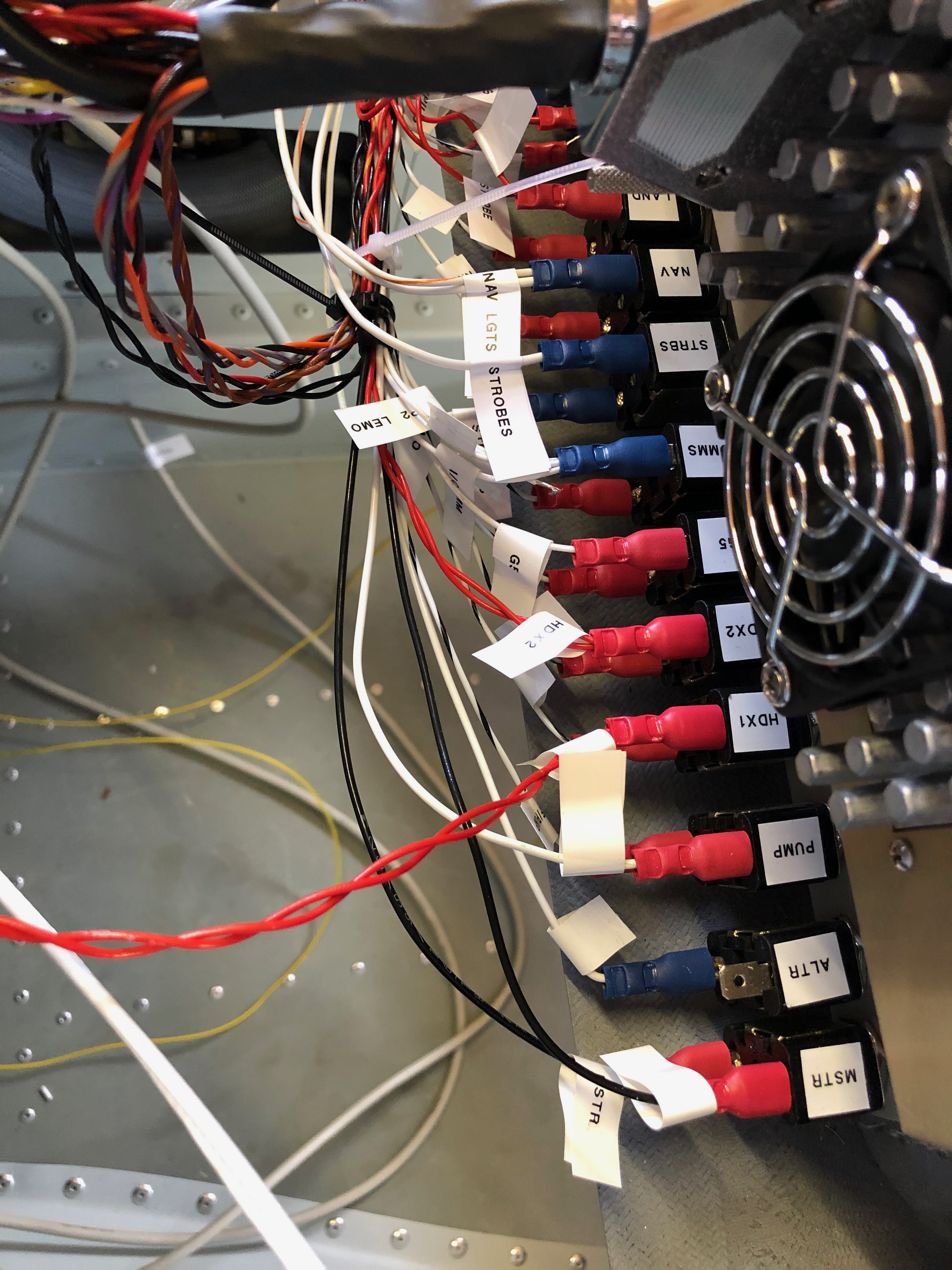 Wiring continues! Most of the time it takes is making sure that the routing will work for the circuits concerned, keeping it tidy and labelling the wires. Hopefully I’ll be finishing the landing lights, nav lights and pitot circuits if my delivery of wire arrives today. but most of its done now.