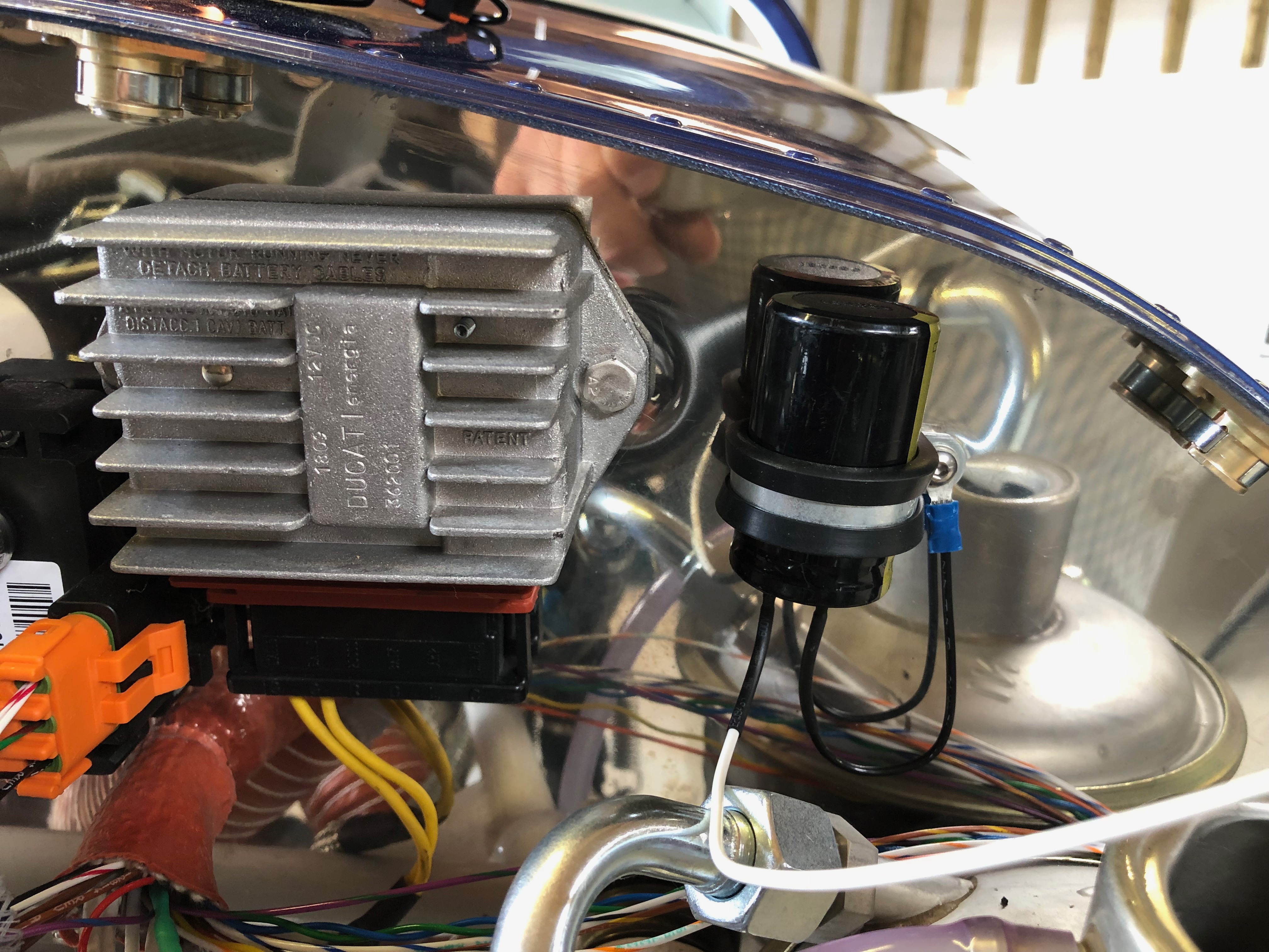 I decided to make a bracket out of some aluminium angle that could be fixed to the strengthening that I added to the rear of the panel.After cutting 2 pieces 15 cm long I riveted a piece of the offcuts from the panel to use as a surface to mount the unit.The mount works well but unfortunately there really isn’t any other place for the GPS so it will sit on this mount under the glare shield. Next up is installing the wiring for the charge circuit. It requires a large capacitor that smoothes the output and protects the regulator unit from overcorrect spikes.. The completed charge circuit. It’s simpler then circuit diagrams make out. I decided to get new Ray Allen control stick grips which are an enhancement on those supplied with the kit. They have 7 buttons instead of 5. The stick wiring requires 8 wires to be run down the control stick and onto various contacts. 4 are for the trim up, down, left and right, 1 is for ground, 1 for PTT and the other two are for whatever you want to use them for. I’ve decided to use one for autopilot disconnect and the other for the autopilot ‘Level’ function.