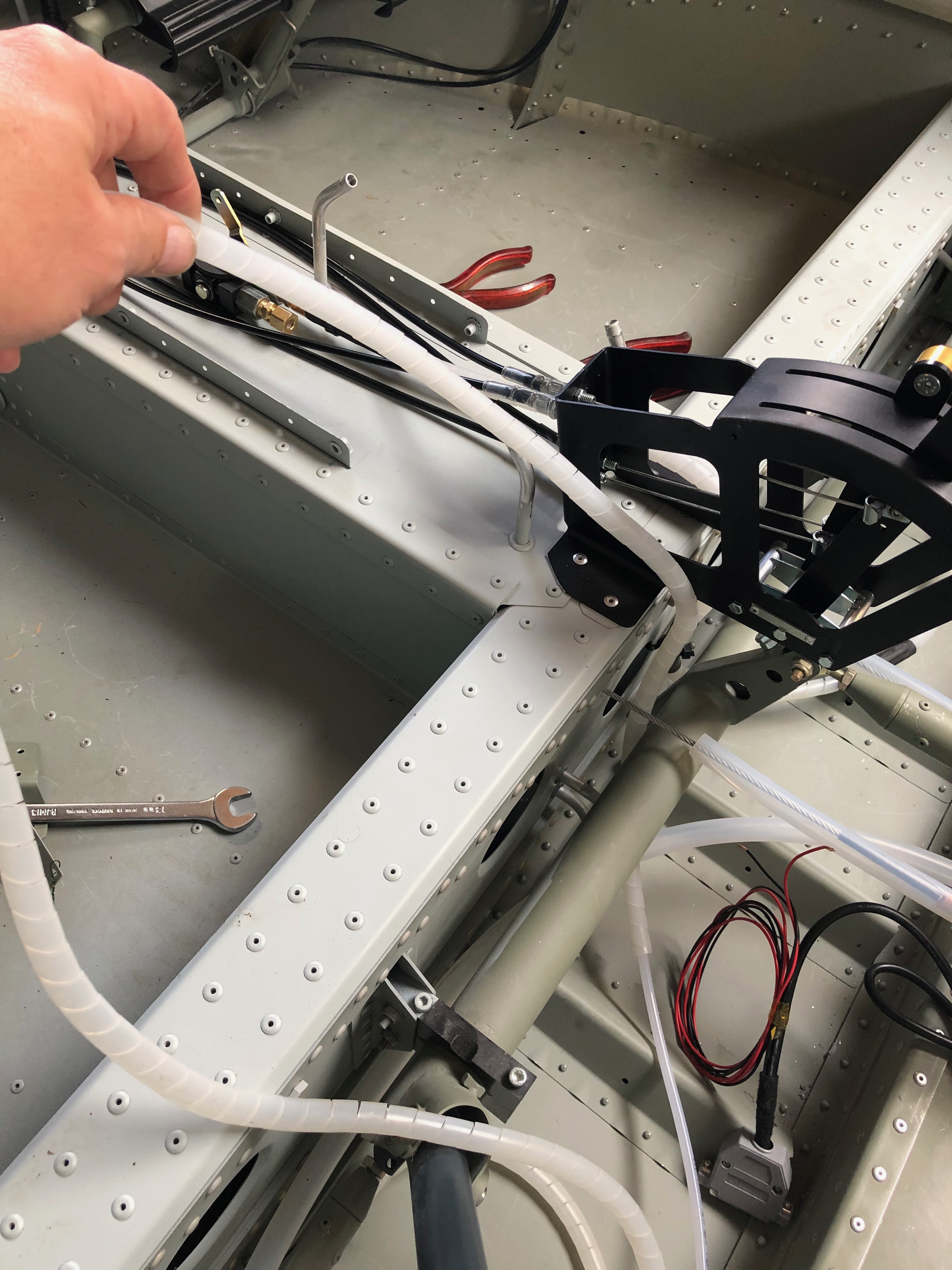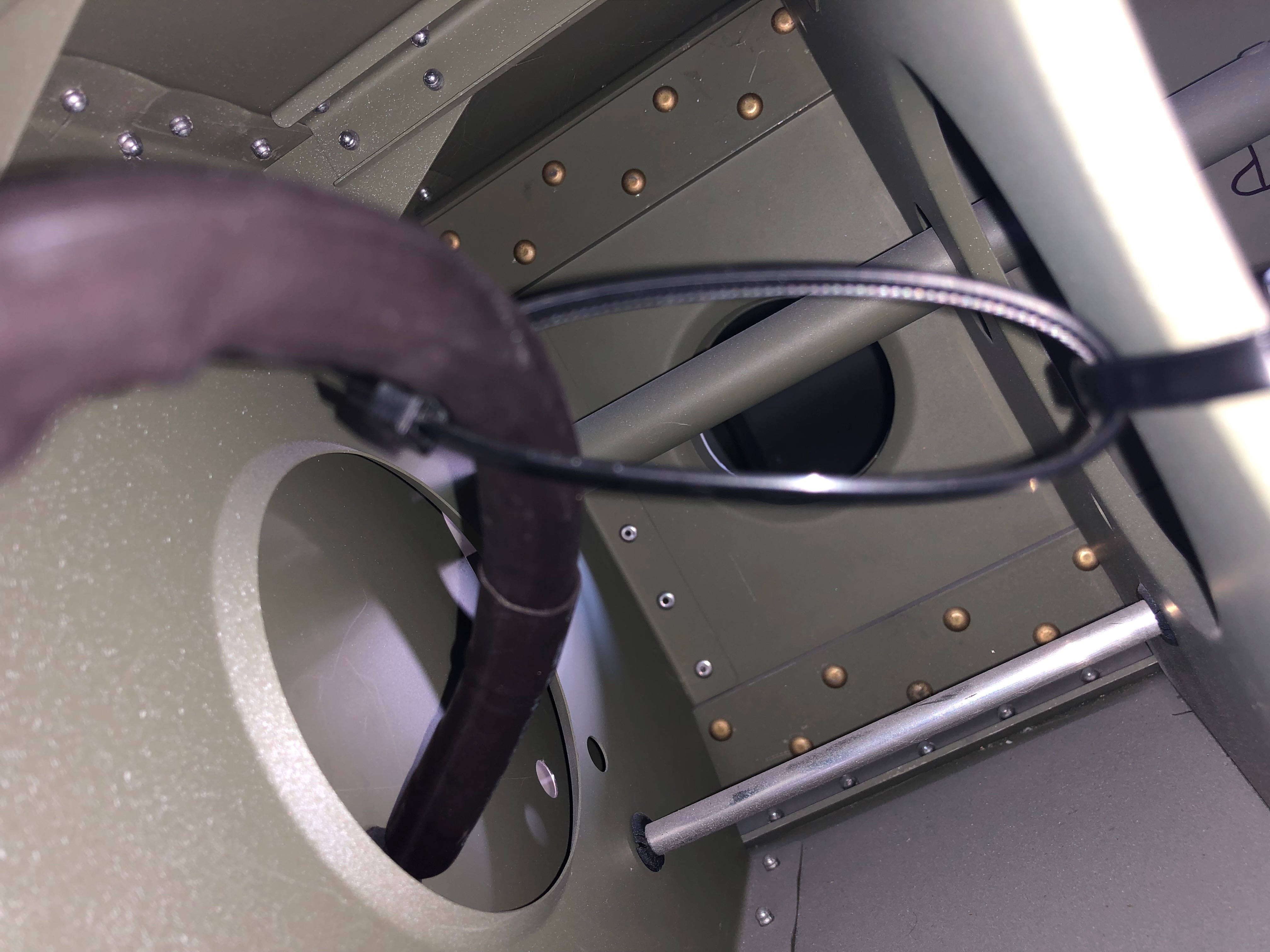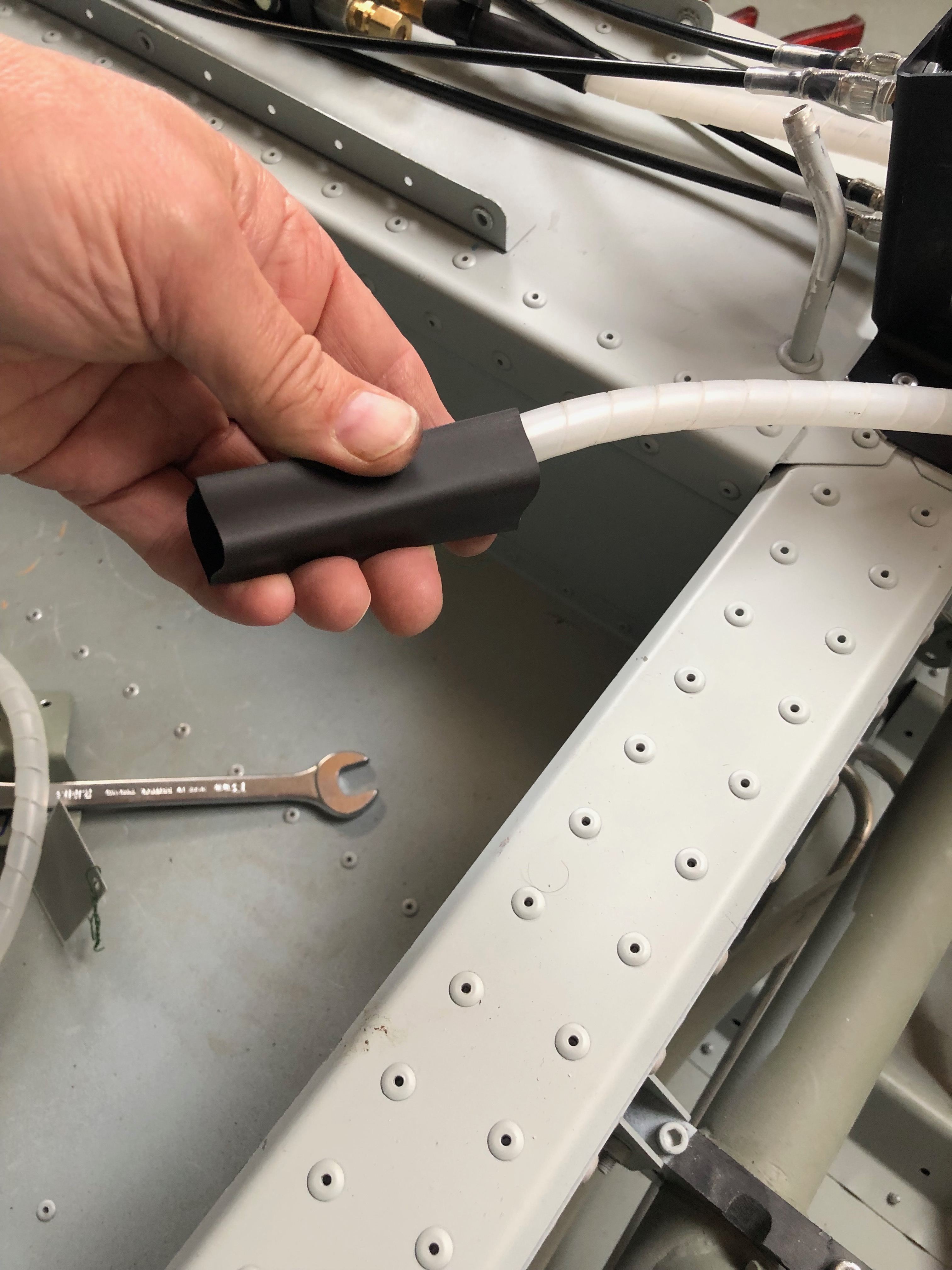 After running the hydraulic pipe to the side of the fuselage it’s covered with a protective sleeve to prevent the pipe from chaffing. I’ve chosen to use a spiral wrap similar to that used as a cable tidy but more substantial.