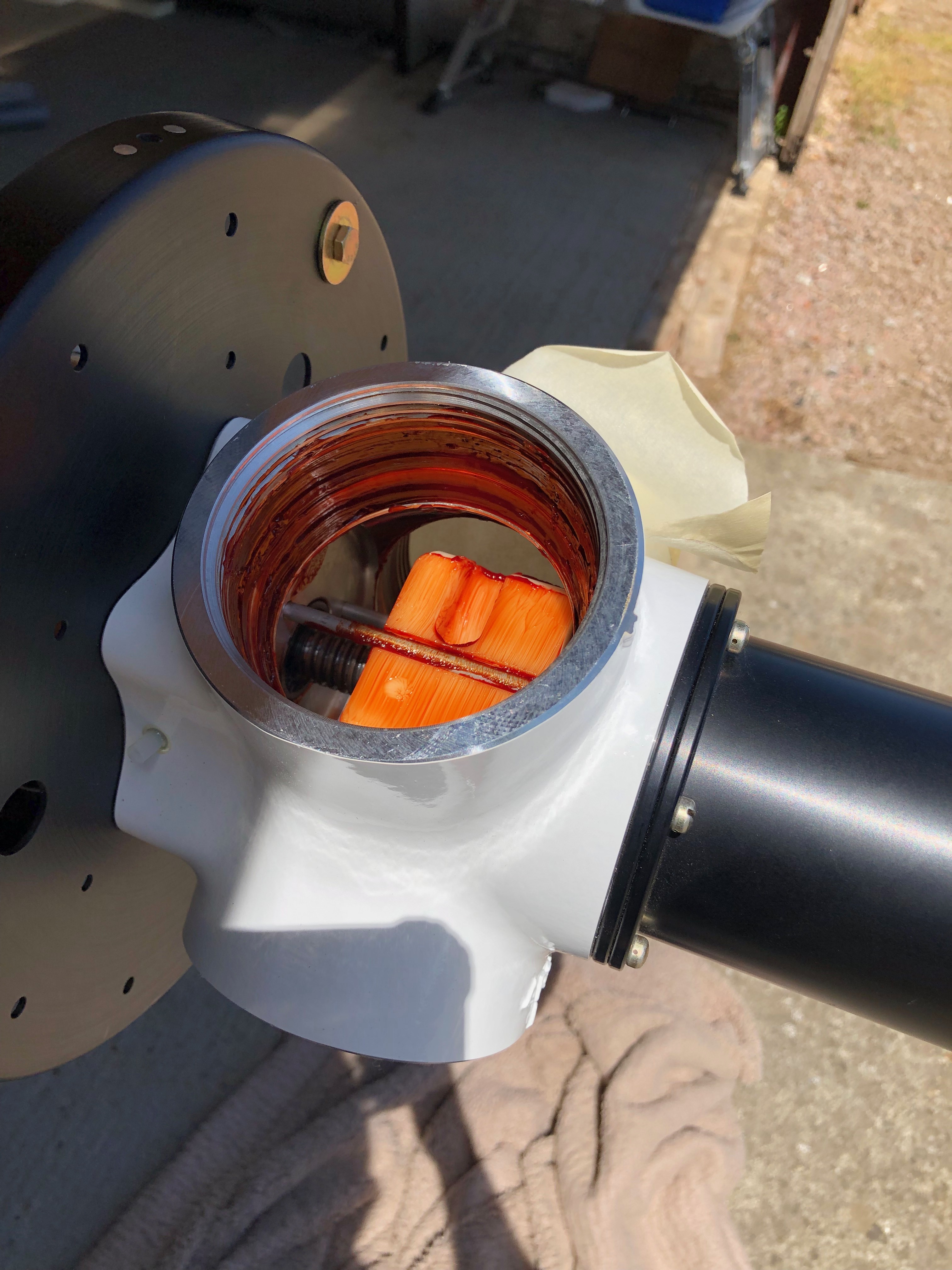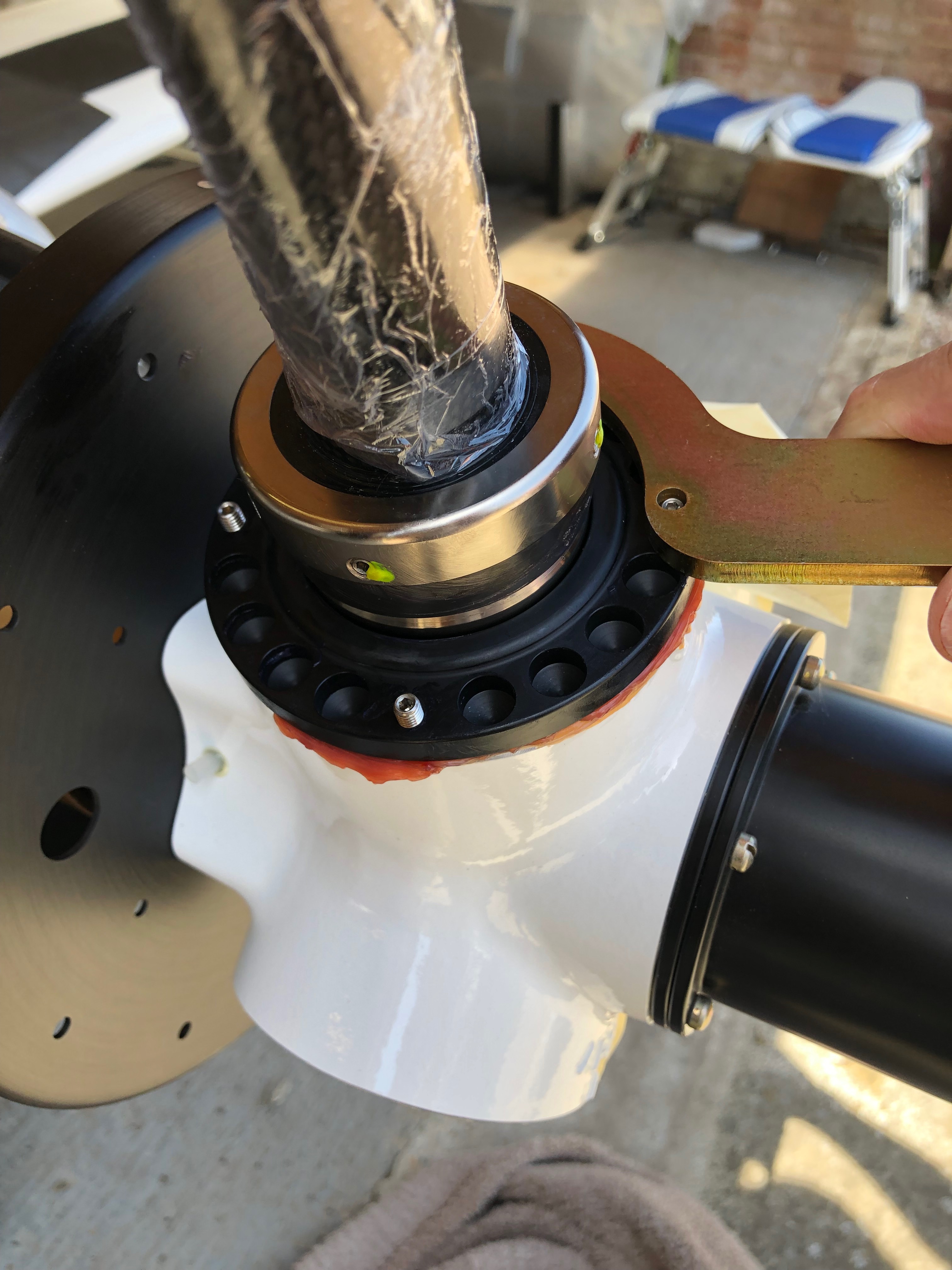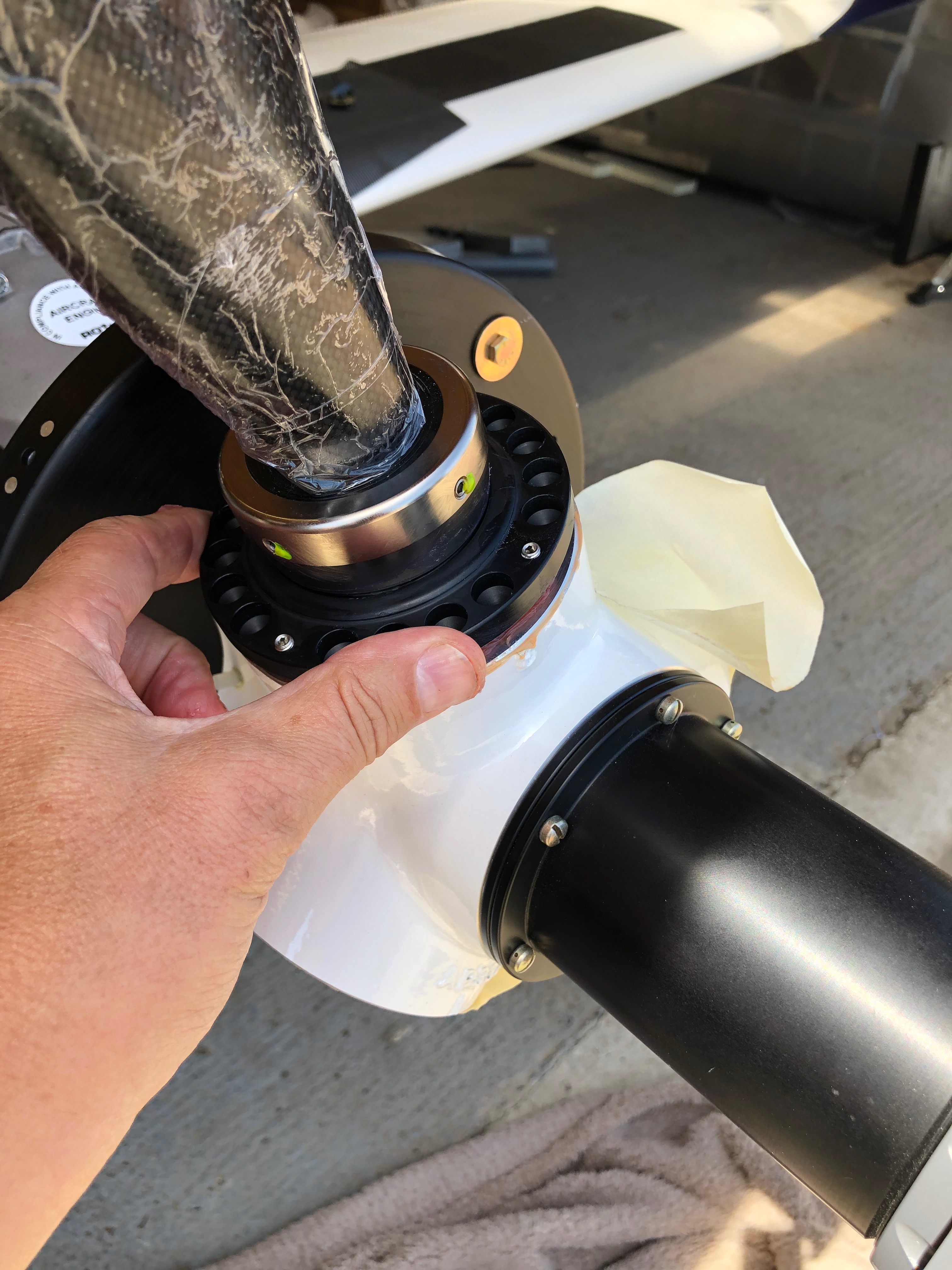 Once the protective seal has been removed it reveals the pitch change mechanism. It’s been greased after manufacture but needs a further coating as per a service bulletin.I think I may have ordered the wrong size tin of grease 🙂 It was at a bargain price which was cheaper than smaller tins. The hub is liberally coated with grease before being installed.Each blade is simply screwed in……the set screws are unscrewed to leave around 4mm showing.A special ‘C’ spanner is fitted on the set screws which is used to tighten to the specified torque setting using a torque wrench.Job done, looks quite good. A quick test of the pitch system confirms it’s working as expected. Now for the oil system purging and filling the coolant system which has taken a lot more than the 1 1/2 litres that Rotax advertise to fill the system so I’ll need to get some more tomorrow.