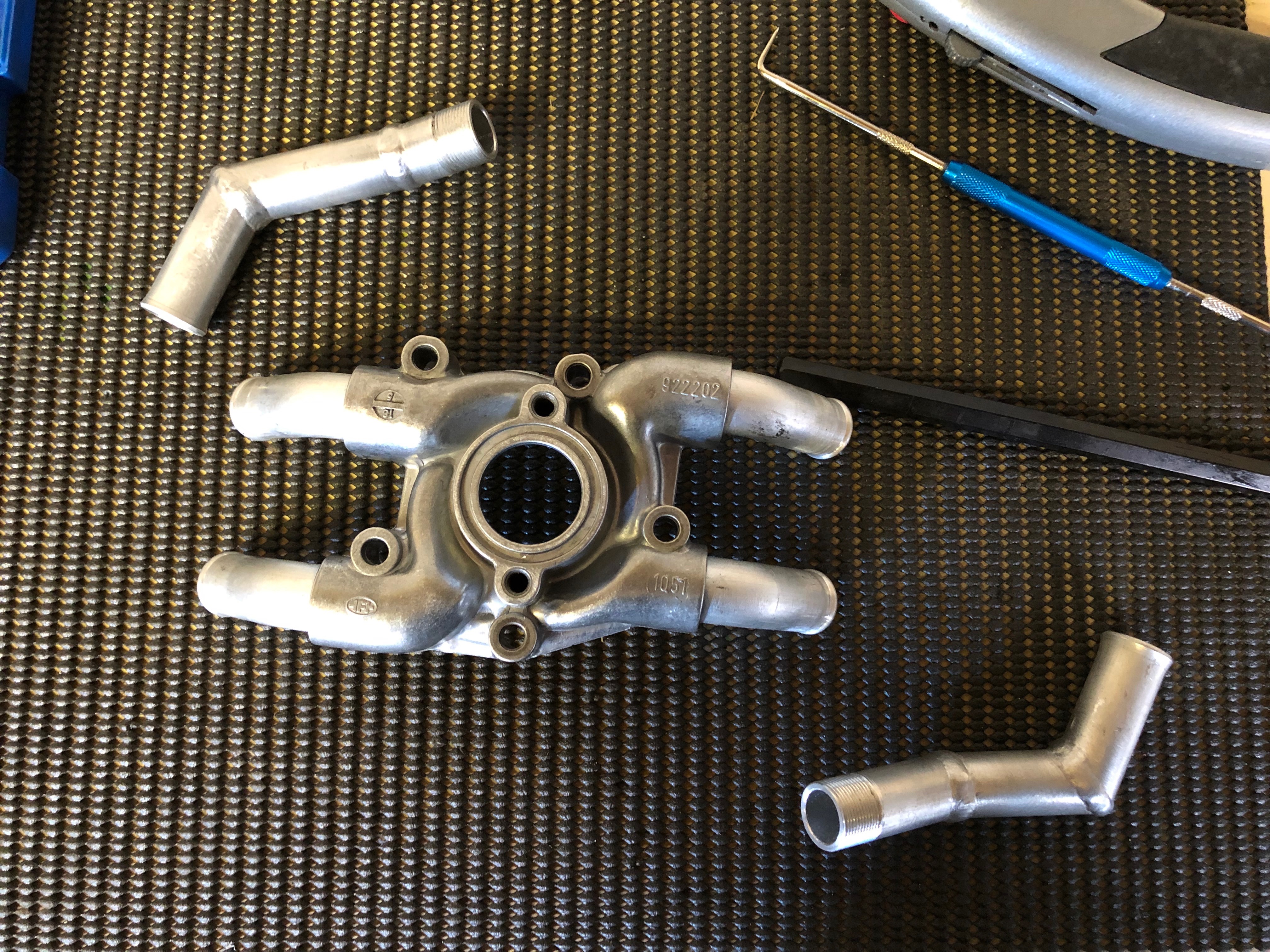 Time to modify the pump. The top left and bottom right pipes will be changed and the other two will be removed and refitted at a different angle to suit the Bristell engine mount.