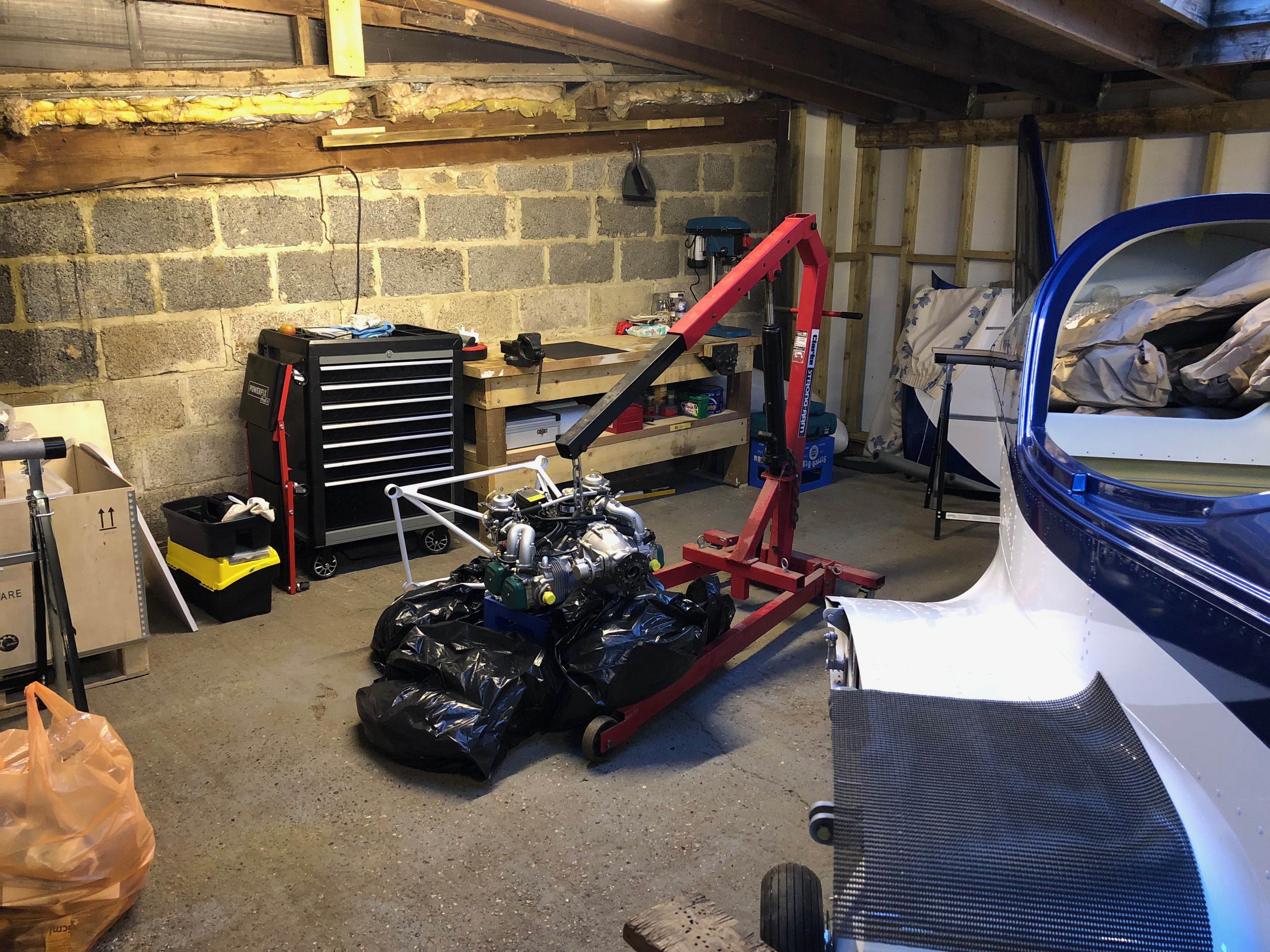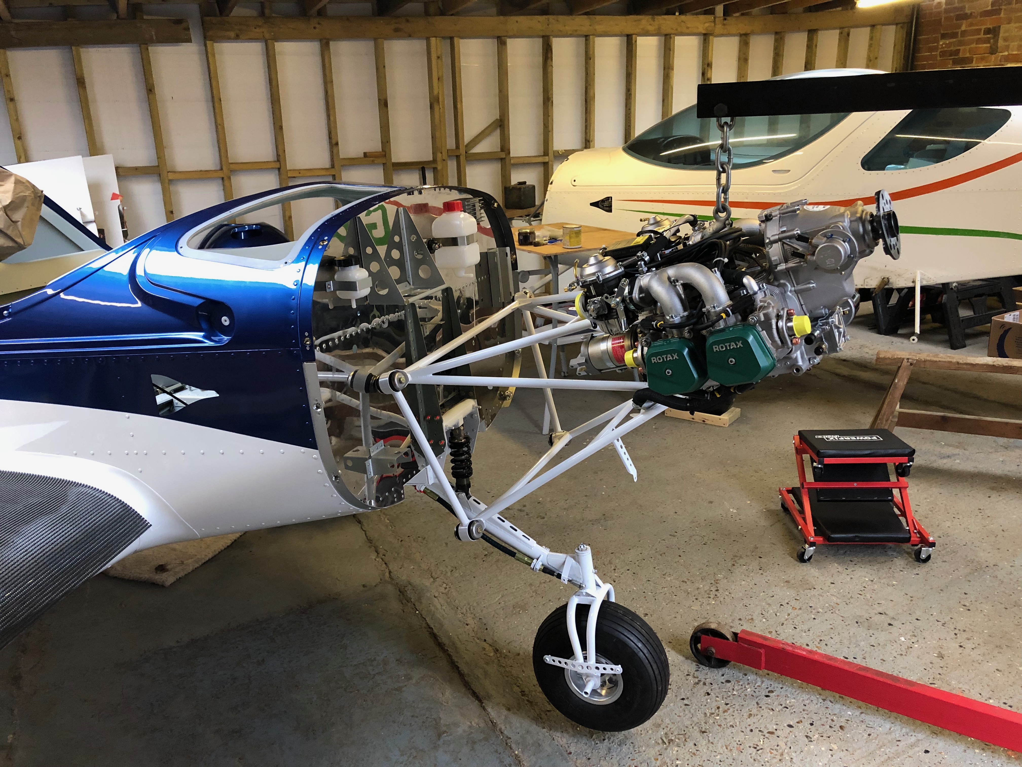 Time to hang the engine. The engine hoist and engine is positioned just in front of the fuselage and hoisted to roughly the correct height.