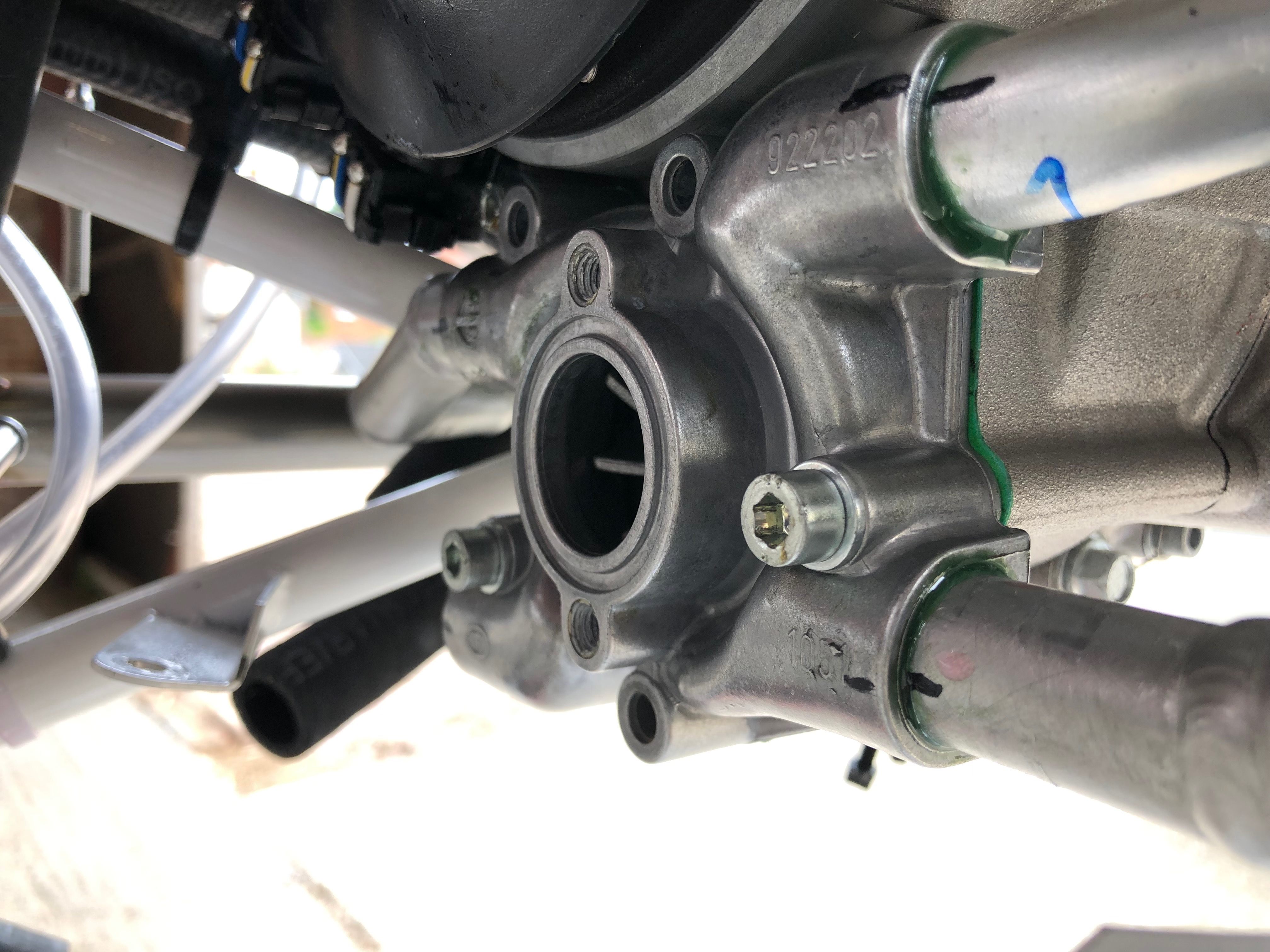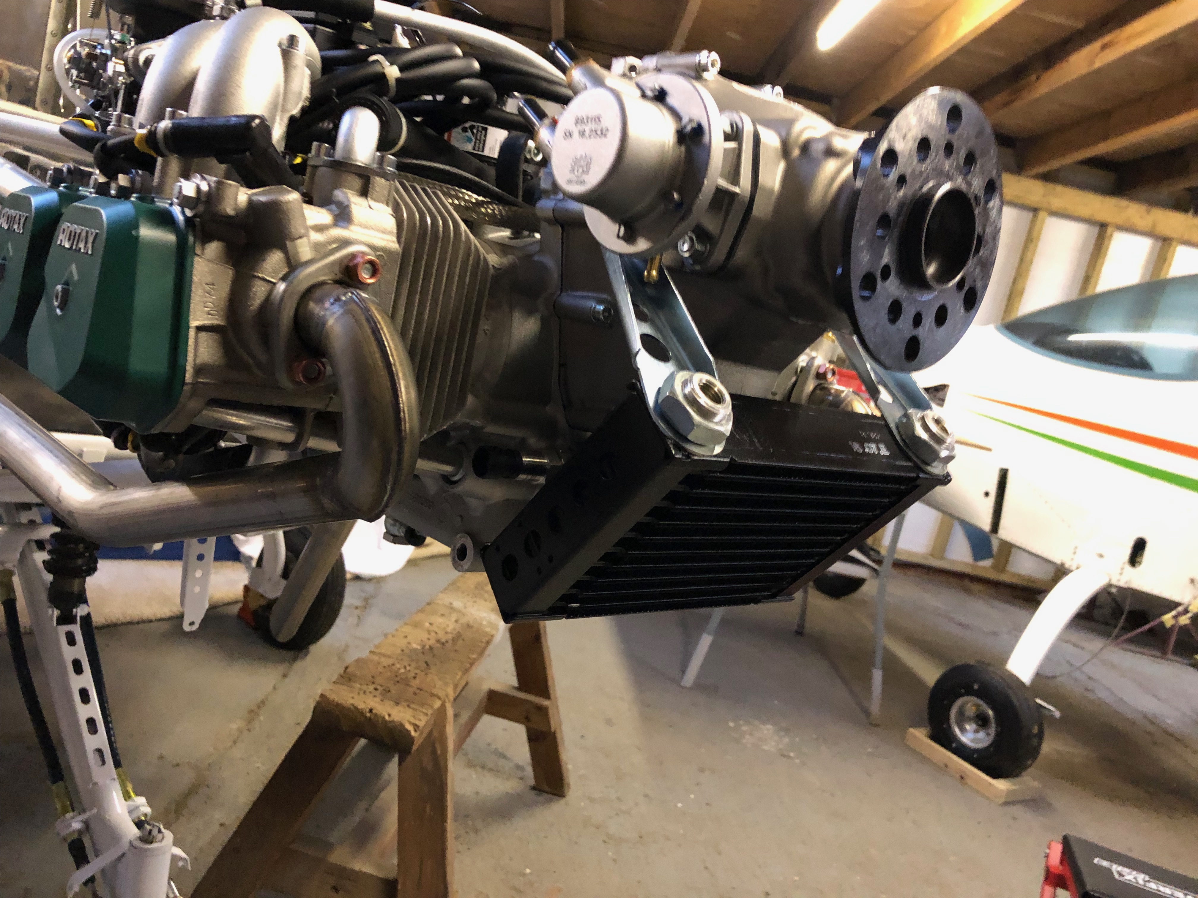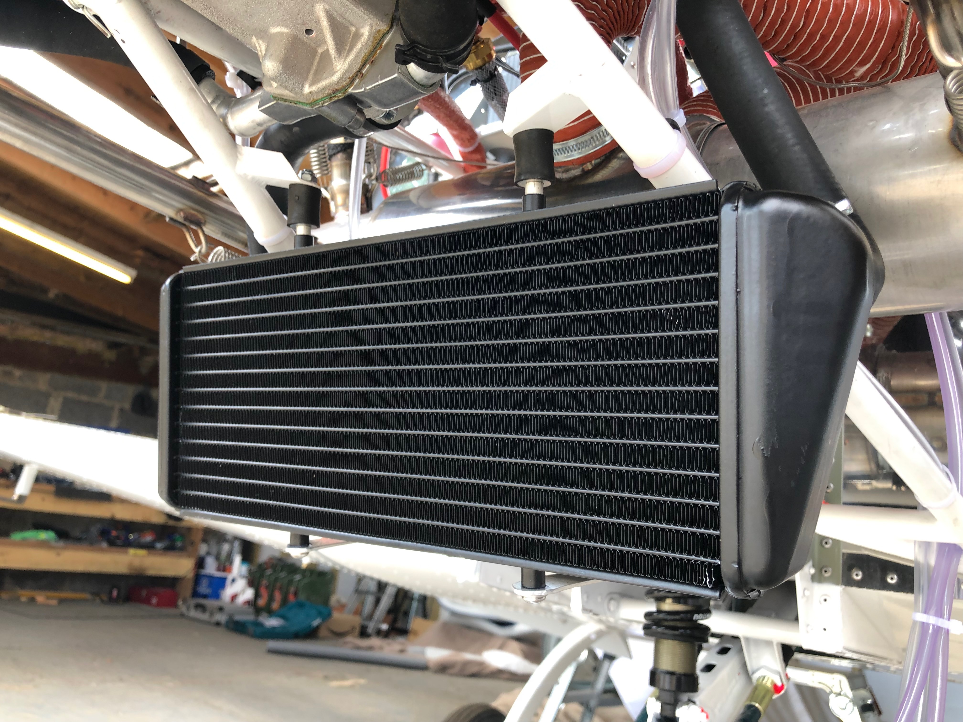 The water pump refitted clearly showing the new position of the modified pipes around the Bristell engine mount. The rubber pipes will be refitted tomorrow allowing the Loctite to further harden.
