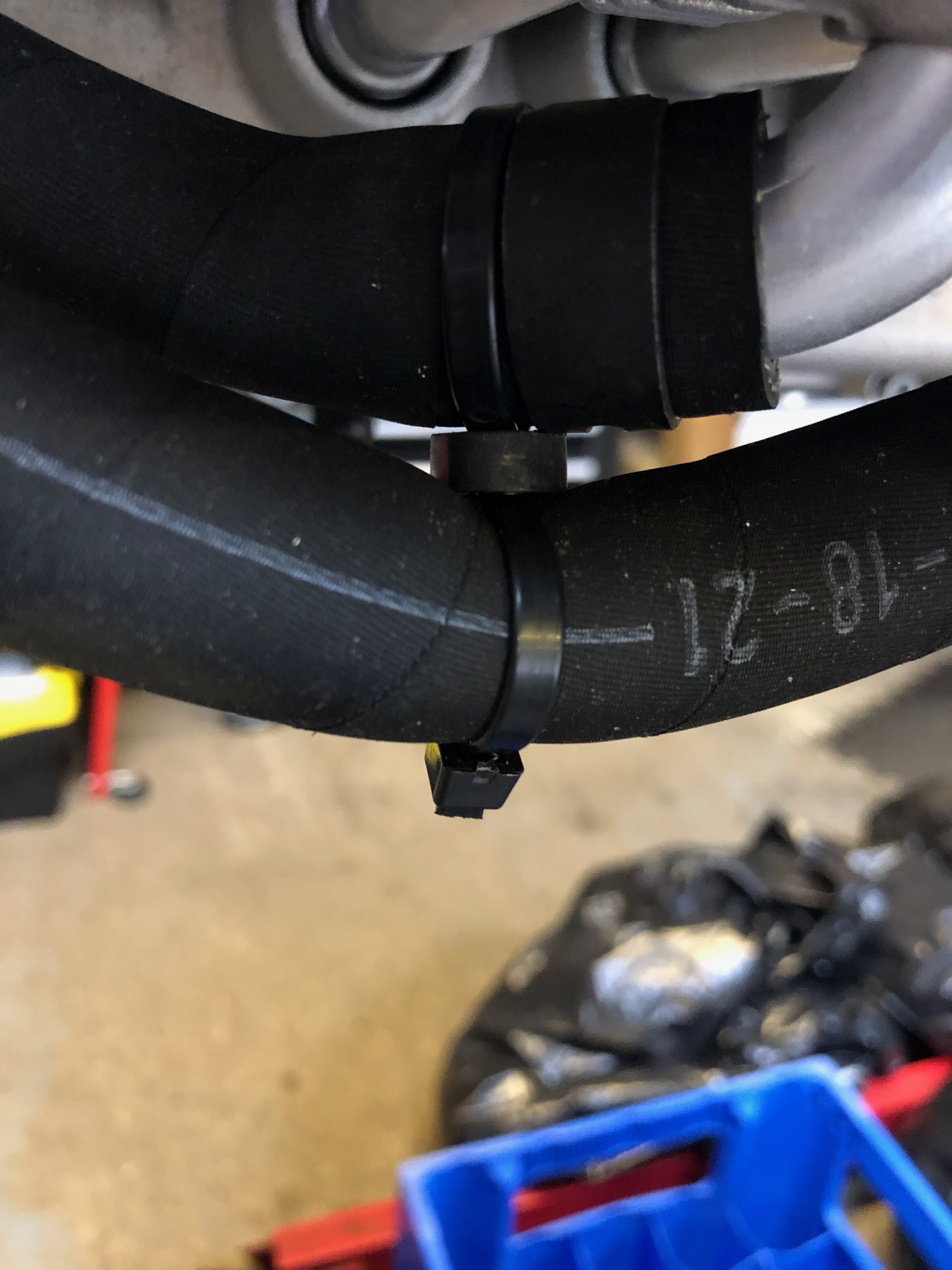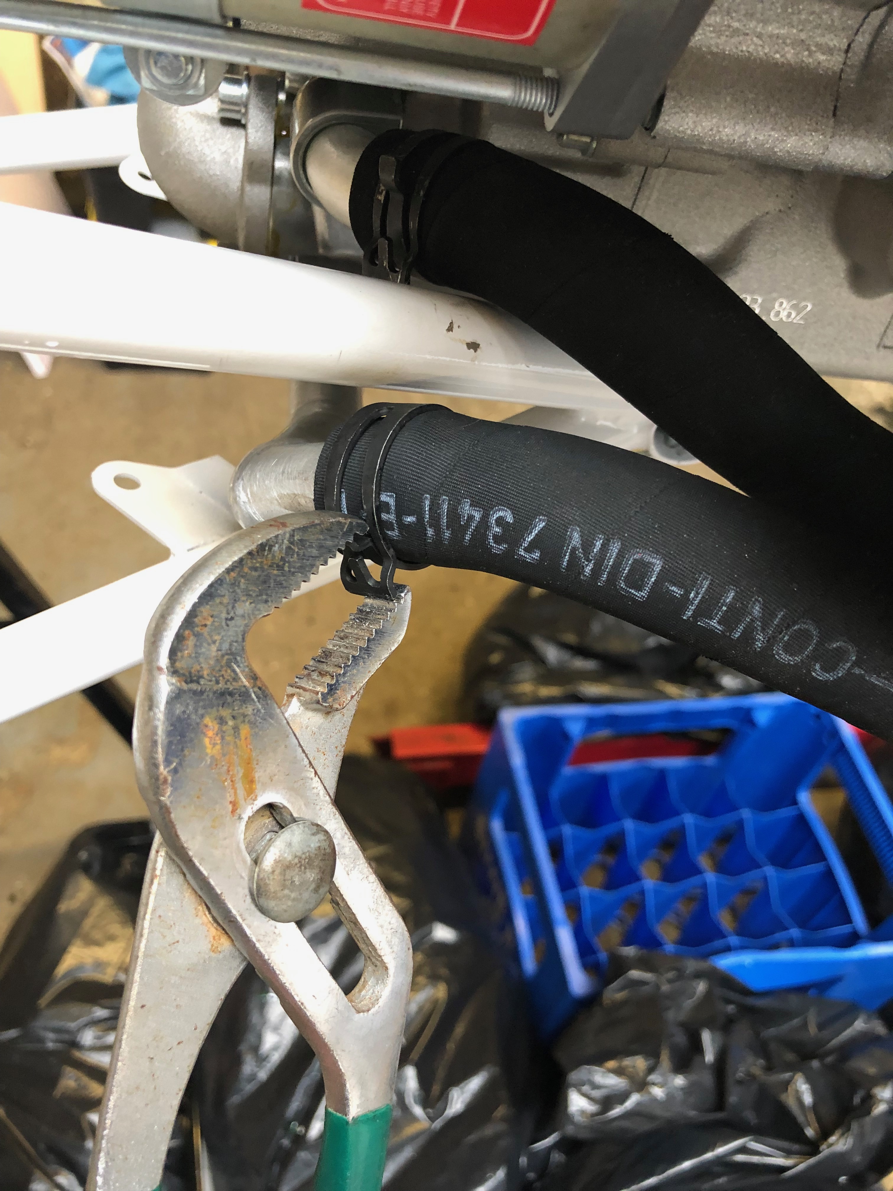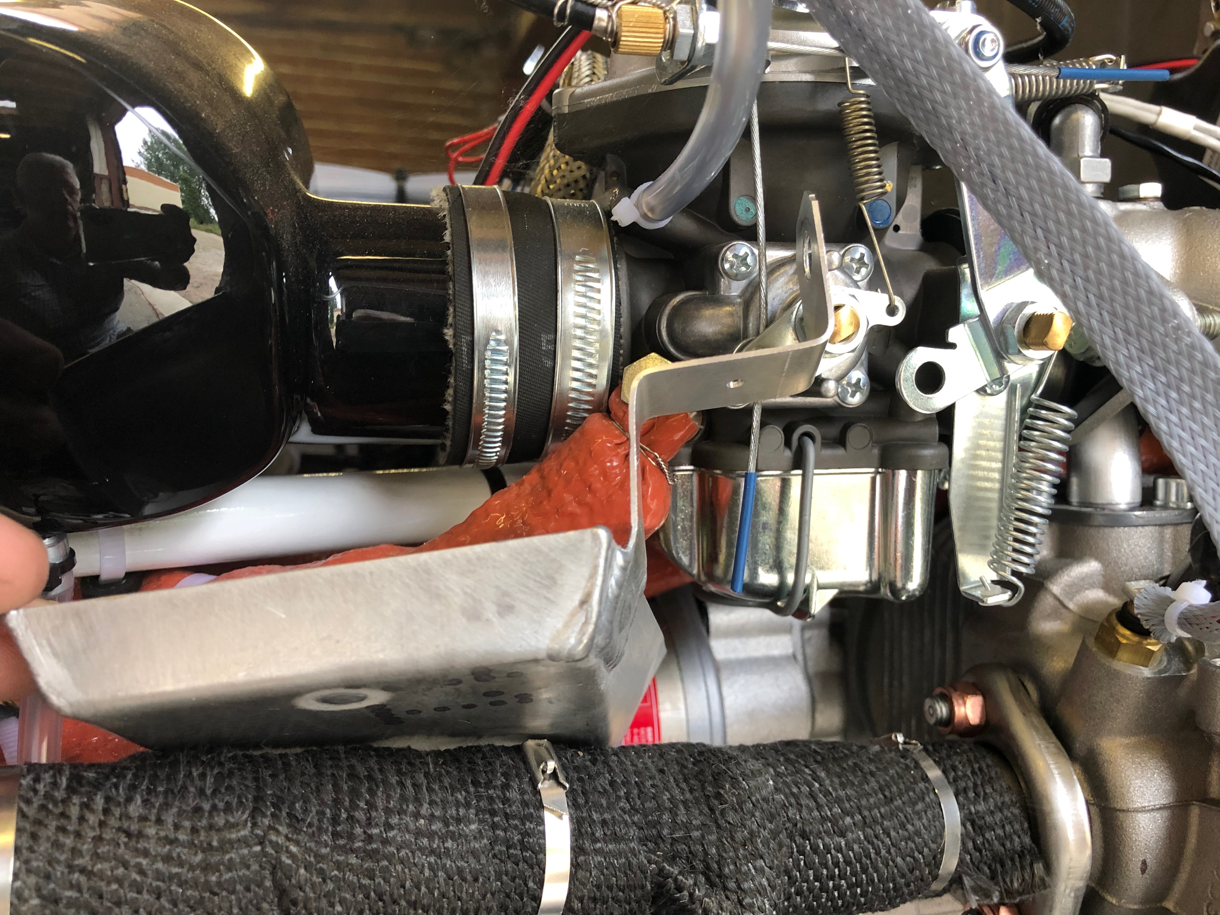 The water pump refitted clearly showing the new position of the modified pipes around the Bristell engine mount. The rubber pipes will be refitted tomorrow allowing the Loctite to further harden.