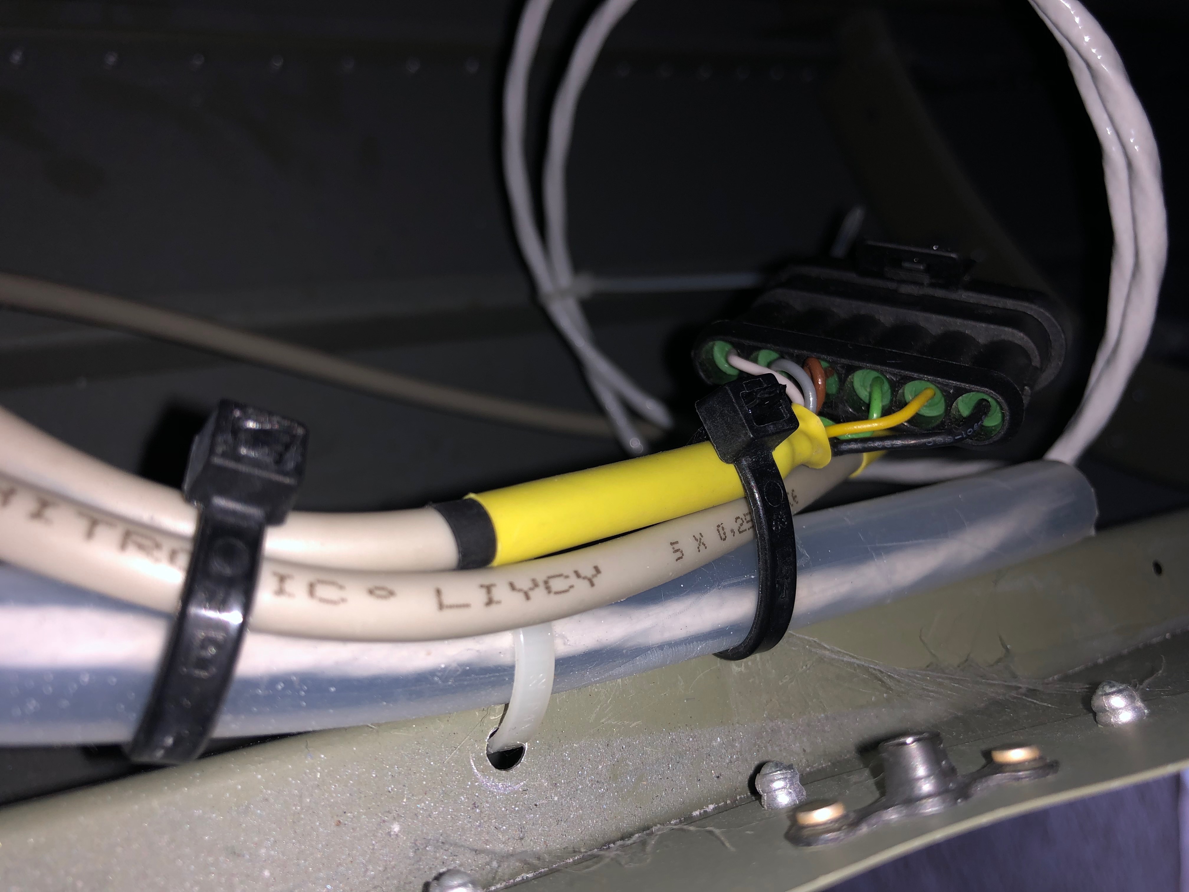 With the water pump dismantled I need to use a M18 x 1 die to cut further down the pipe to provide a better seal than achieved on the first fit. This is a revised method that has worked for others that have had this problem according to Bristell.The wires connecting the lights, strobes, trim motor and pitot in the wings need to be protected so a piece of flexible conduit is used.The elevator trim and lights connectors are secured to prevent them from moving in service.The artwork for the registration has been prepared and I’m obtaining a couple of quotes before ordering.