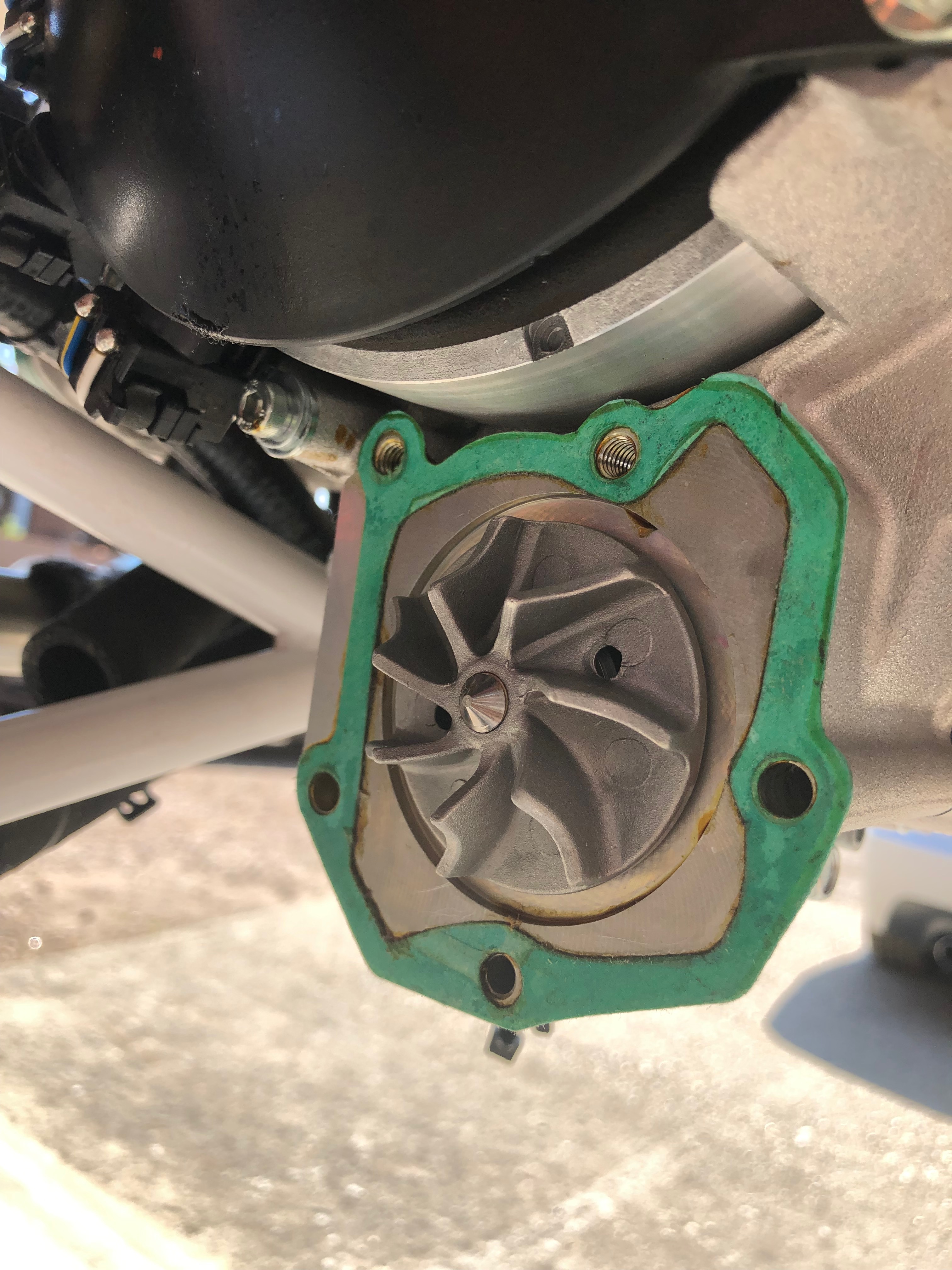 The slight leak. Can’t ignore it, if it leaks with no pressure in the system it’ll certainly leak a lot more when the engine is running.So the coolant needs to be drained……so I can remove the pump. I’ve removed the pipes from the water pump, cleaned the thread but now have to order an 18mm die. I’ll use the die to cut a slightly longer thread.As I can’t do anymore on the water pump I though i’d Loctite the12 set screws, 4 on each blade and…… add some Torque Seal on the set screws to allow any movement to be identified. I know have to wait for the Die to come before I can finish off the water pump.