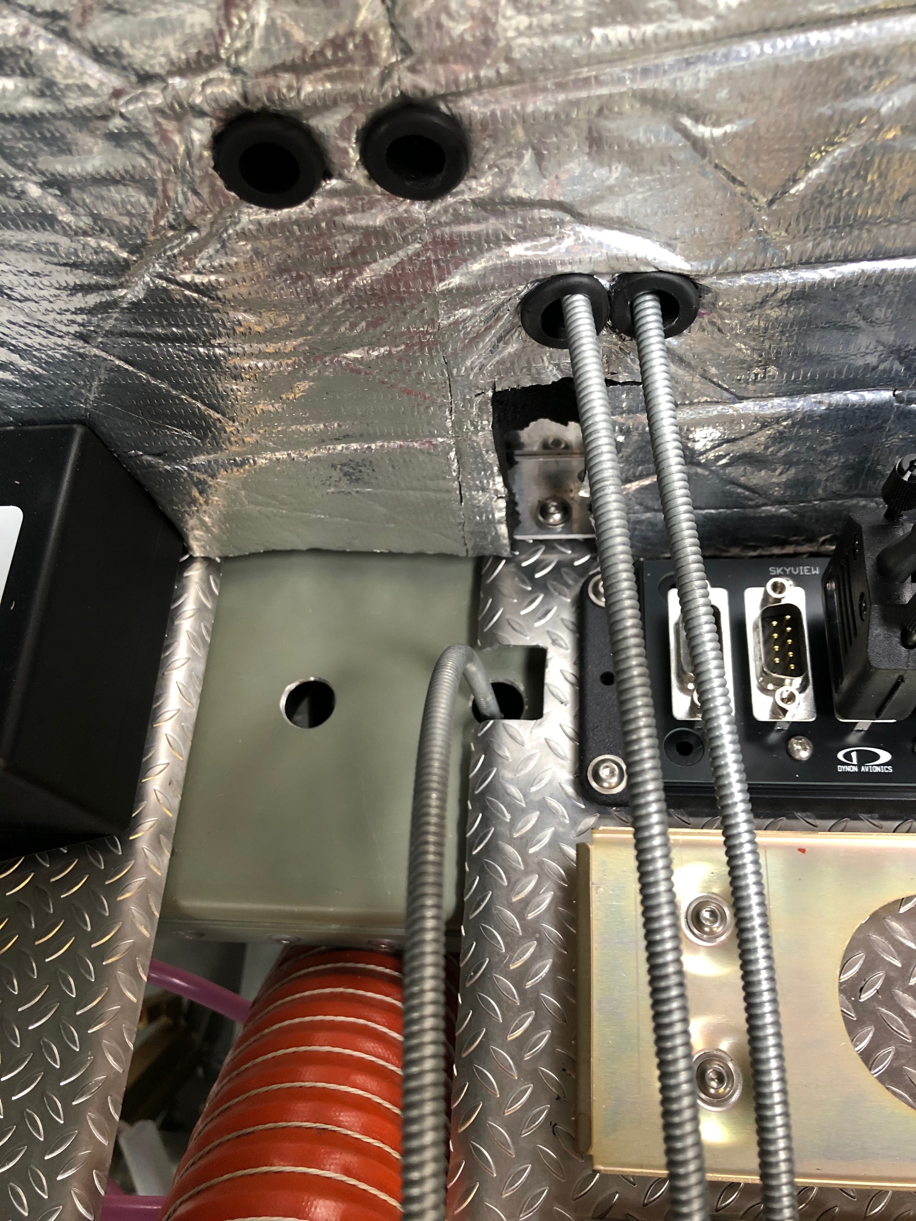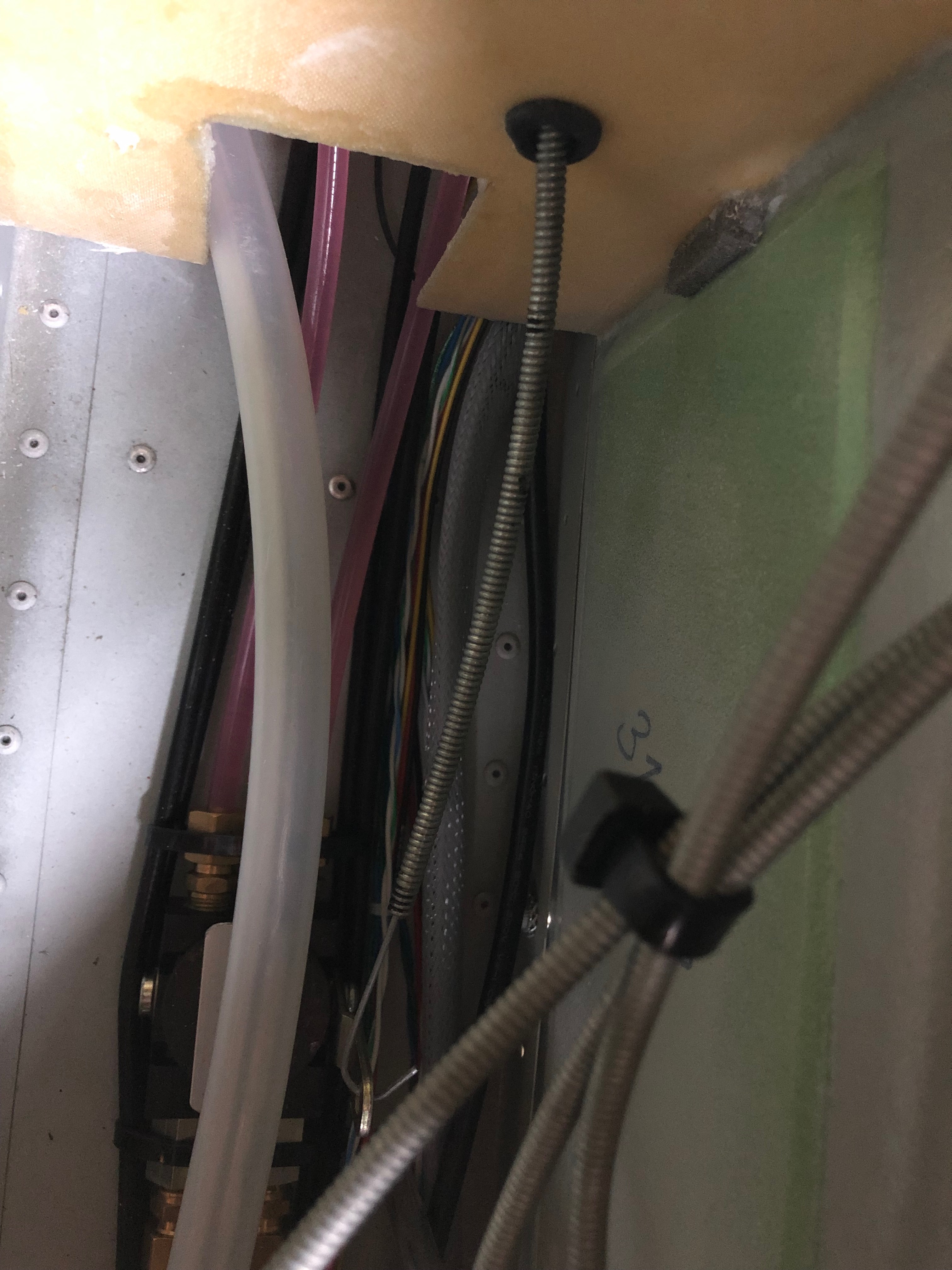 The starboard wing has a single pipe that runs from the fuel tank in the wing to the fuselage. It’s quite a tight fit so need to make sure it doesn’t kink and it’ll need protecting with some sheathing.The Port wing fuel tank has two pipes one for supply and one for return. When starting the engine it’s important to select the Port fuel tank as any surplus fuel is returned to that tank. If it’s already full it will overflow. Must make sure you don’t get the supply and return mixed up!The feed and return pipes from the fuselage. The bottom one is the return.I’ve already fitted the centre canopy release mechanism so all that is required is to drill and shape the two holes for the LEMO headset sockets. They fit from underneath so they can be fitted with the sockets already attached.Last job of the day is to fit the rear trim panel. I decided to make the panel removable so Rivnuts and screws are used to secure.