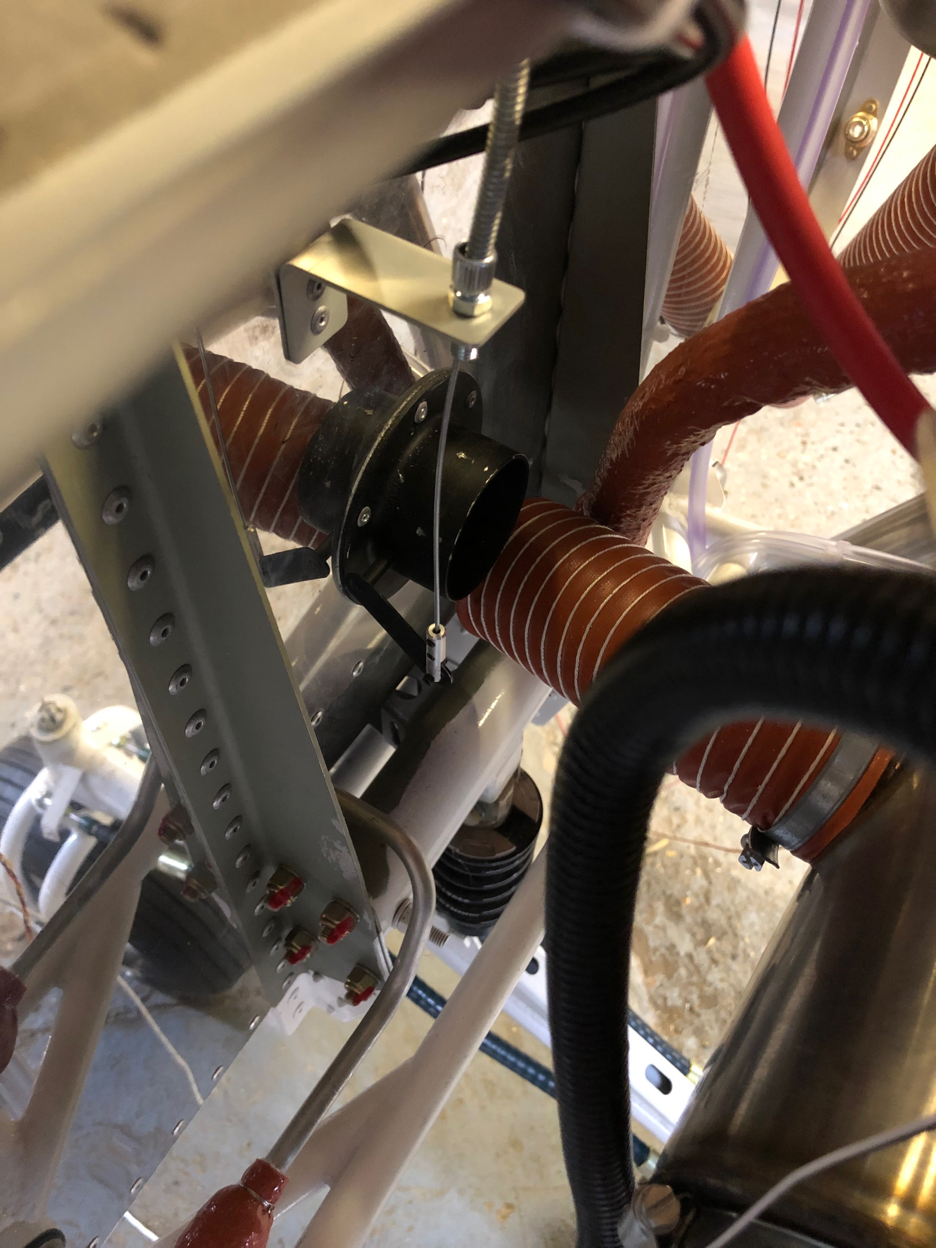 Tom always comes equipped for the job. I think he was was going to work on a JCB not a Bristell!The demist, heater and carb heat control cables routing over the equipment tray.A test of the parking brake proves that the cable will bend and fail to operate without additional support. Inside the centre console there are quite a few other cables and they need to be positioned so they don’t interfere with each other. In addition to this the fuel pipes have to fitted to the fuel selector.Our solution is to prevent the outer cable from bending piece of aluminium tube and then making a bracket to support it in the console.This looks to be a good solution to the problem. A final wire lock ensures that the cable doesn’t move, so full movement is realised.A radio control clevis is used to connect to the cable. Time will tell whether this is a reliable solution.The connector to the heater and……carb heat controls are very straightforward but the outer cables still need to be fully secured otherwise the whole cable will move and fail to operate the attached item.The demist attachment required a different solution and after some thought we came up with the idea of using a piece of 2mm aluminium to extend the RC clevis.The final solution which will do the job. The only thing to do is fit it!So Tom launched into action! It’s all a bit difficult to get to.But the solution worked well.With two out of the three fuel pipes connected and all the wires and cables routed as require we can call it a day. Tomorrow sees the final fit and we can move on to the prep for fitting the panel and prop.Lovely sky as we exited the workshop. Need to get the build finished so we can go fly in skies like these!