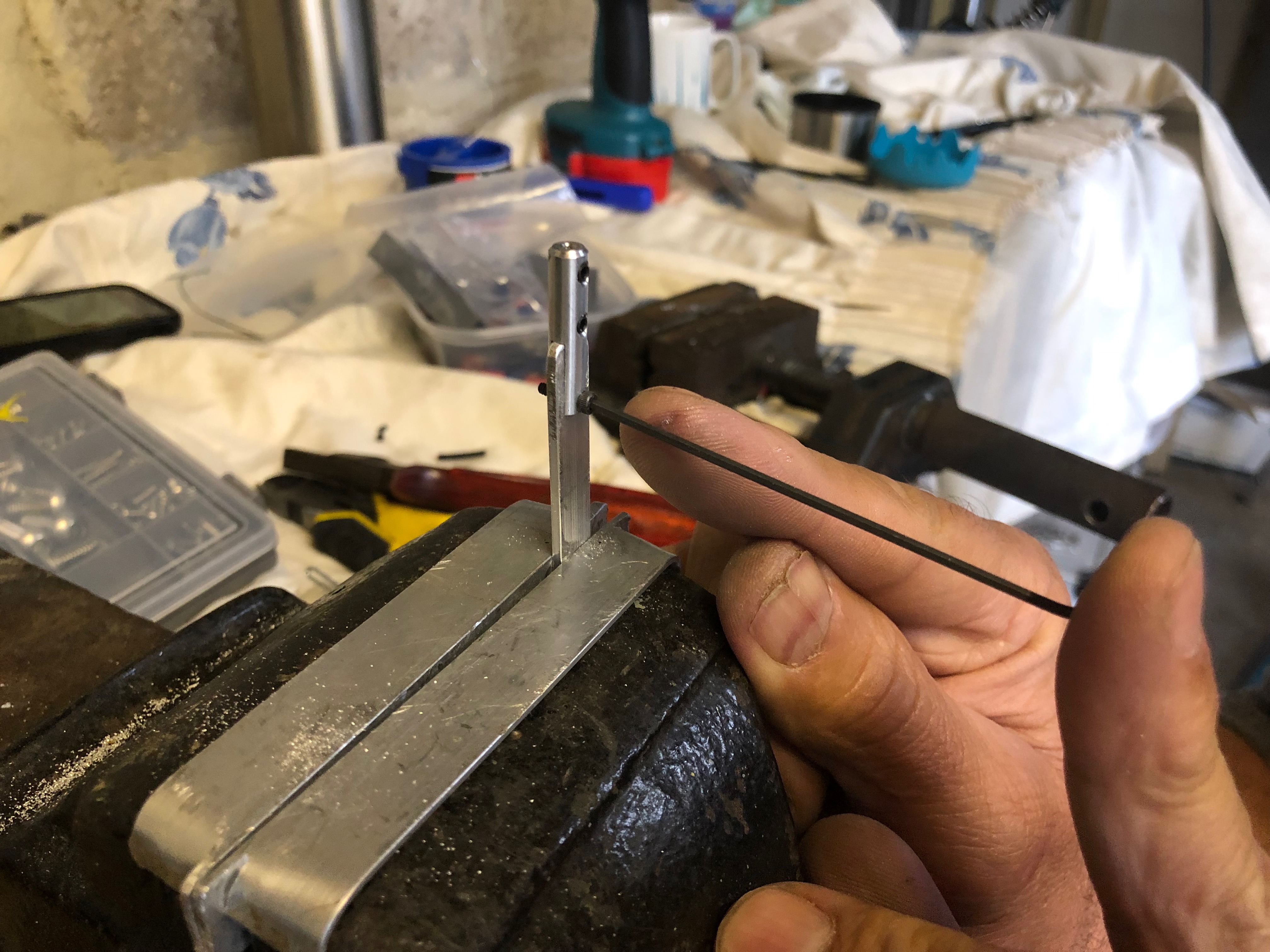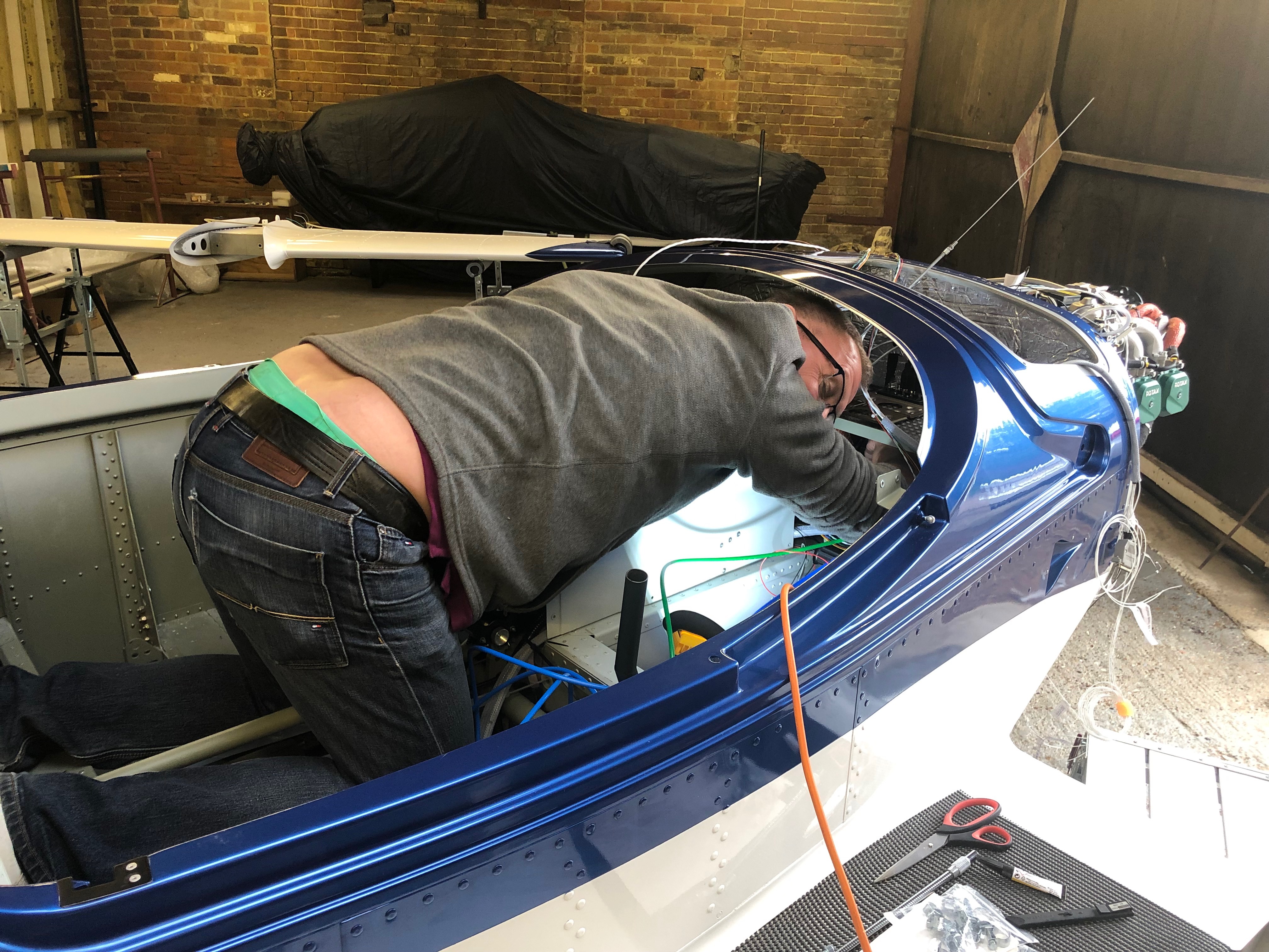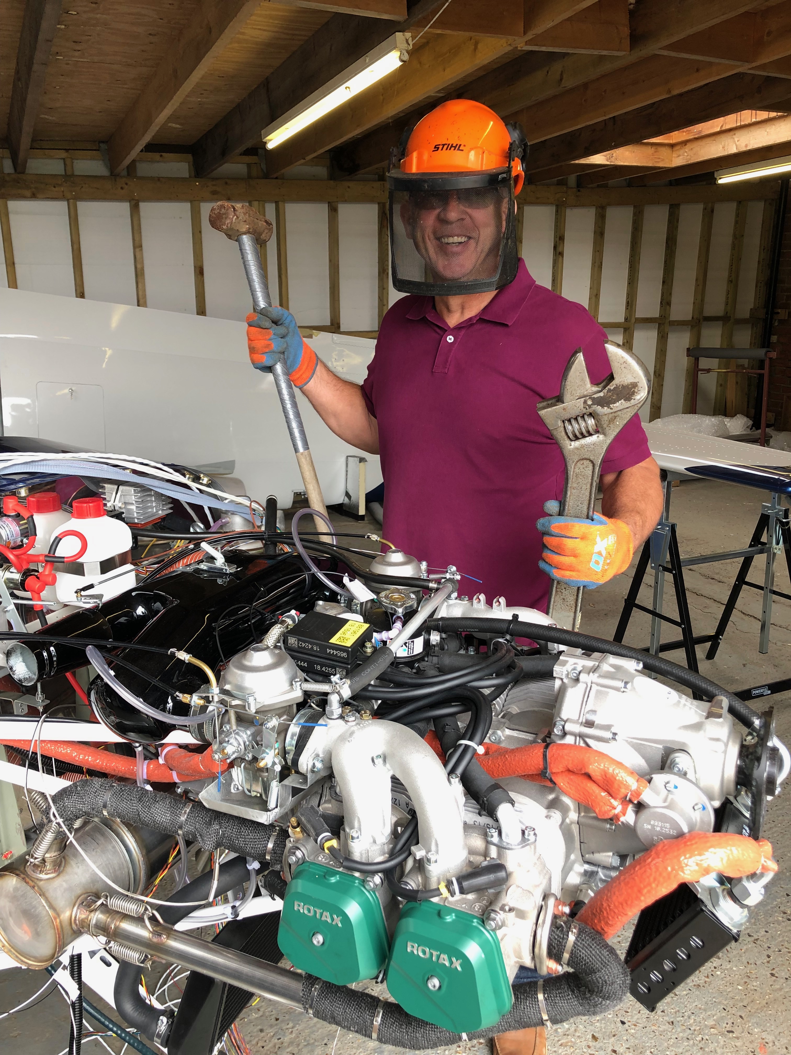 The fuel pipe from the selector to the tanks and engine need to be routed so they don’t kink and cut the supply whilst also being kept away from anything that may chaff them.This shows the support bracket for the park brake cable. It works well.The outer cables are wire locked to the adjusters so they can’t move once fitted.The demist control with the connector we made up. It looks a very good solution.At last the centre console’s complete with all the controls fitted, cables run and fuel pipes fitted. Having received the prop on Monday I can start to install the various bits. This is the mini slip ring available for Rotax 912ULS type 2 engines. It’s fitted to the rear of the gearbox.and then secured in place with a rod hat runs through the hollow gearbox shaft. The control wires spiral round the rod… and exit the front of the engine ready for connection to the pitch motor wires in the spinner.Once the slip ring is fitted the pick up bushes are installed. The bushes need run centrally on the slip ring. That’s all for the prop today, more tomorrow.Moving on to the panel again. I will fit as much as possible before fitting to the aircraft as it’s a lot easier than fitting the components when the instrument panel has been fitted to the aircraft. I’m not sure what Tom is doing here? Perhaps he’s going to start to sing? Captions please! He’s going home today so I’m solo again tomorrow!