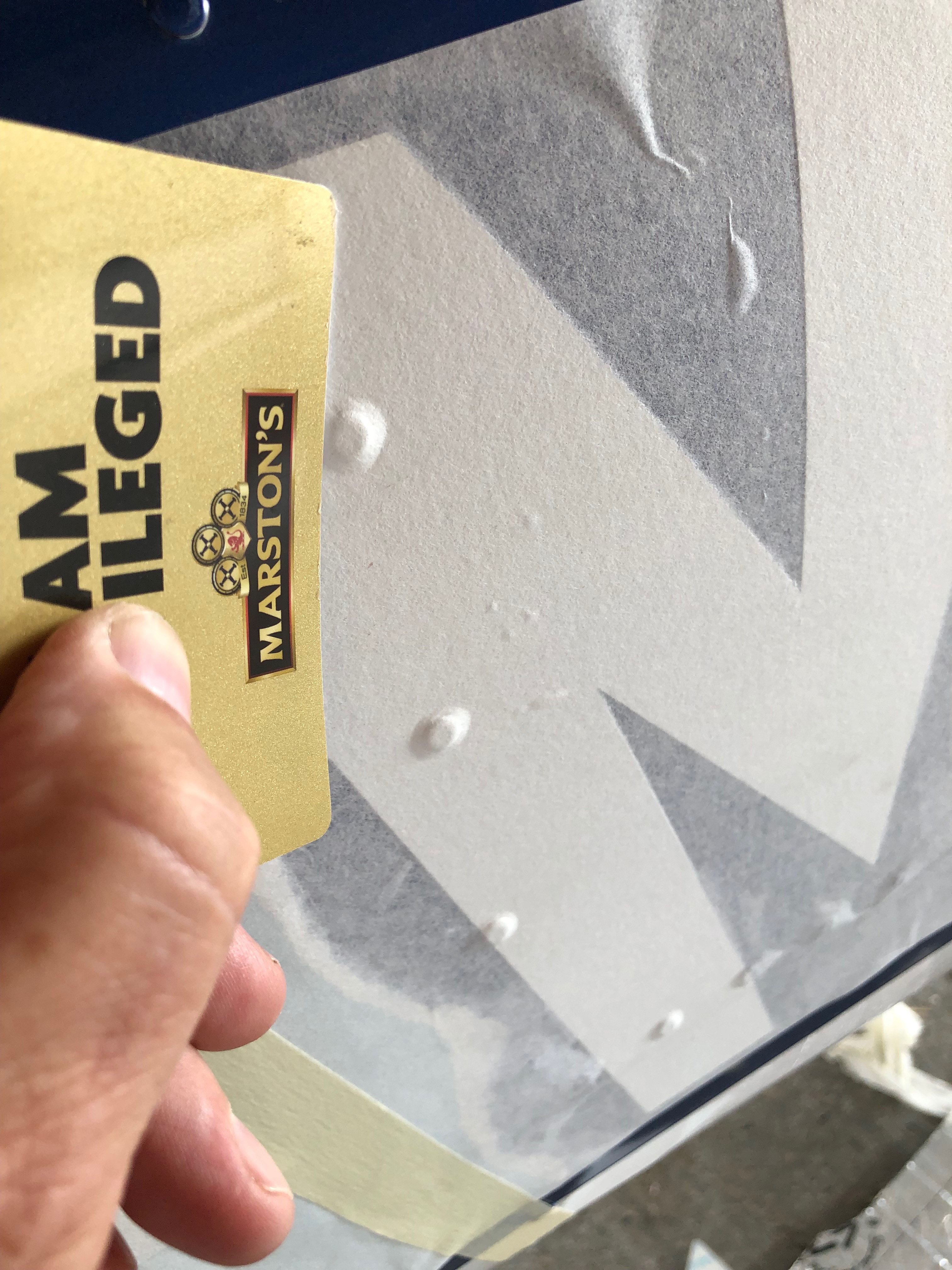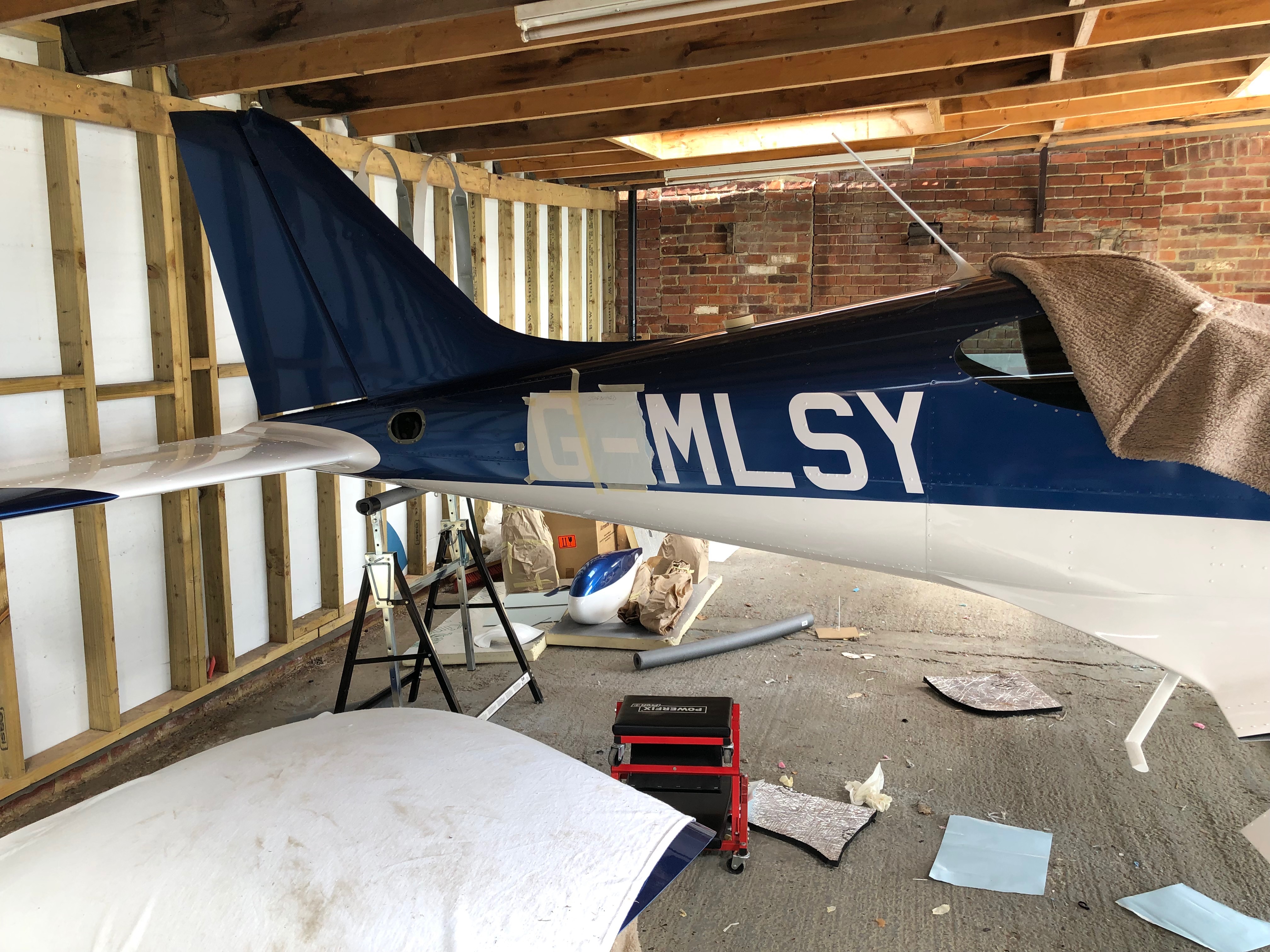 The vinyl registration doesn’t sit well around each rivet that it covers. A little air bubble is present on nearly every one of them. Karen used a fine point to pierce the vinyl and then gently pressed out the air. The result was fantastic and a big thanks to Karen giving up some her weekend to help me.Which looks better? aligning with the rivet line or ……the paint line. We both decided that the paint line was a better option so the decision is made.The spats need to go on as does the spinner and cowlings ready for weighing on Monday.Application of the registration starts. Not many pictures here on how to do it as I was worried about mucking it up.Part way though and it’s looking good. The next bit is to take a little of the spacing out between the ‘G’, ‘-‘ and the ‘M’ as it’ll look a bit better. I should have asked Pete from Mirage Signs to do that for me but I forgot!The final look. Very pleased with the result.A picture shows the inside of G-MLSY with all the seats and trim in place and a very happy me!